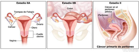 ETAPA II: El tumor se diseminó a los dos tercios superiores de la vagina o al tejido que rodea el útero. A su vez se subdivide según hasta dónde se diseminó el cáncer.