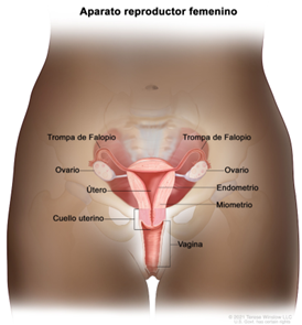 Figura. Anatomía del aparato reproductor femenino. Los órganos del aparato reproductor femenino incluyen el útero, los ovarios, las trompas de Falopio, el cuello uterino y la vagina. El útero tiene una capa muscular externa llamada miometrio y una capa de tejido interno llamada endometrio.